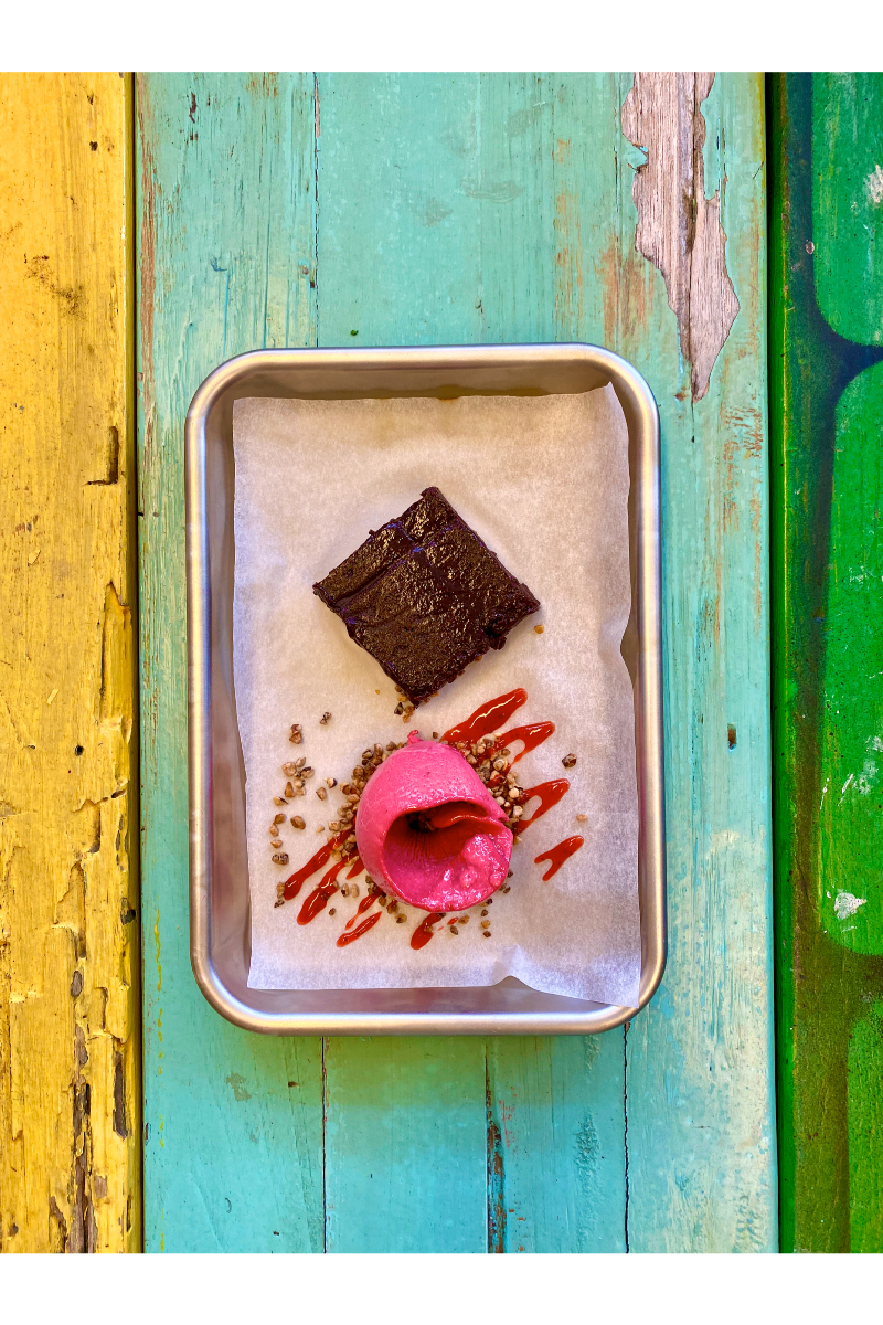 med bringebærsorbet (melk, egg, nøtter)